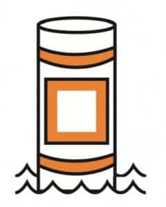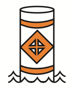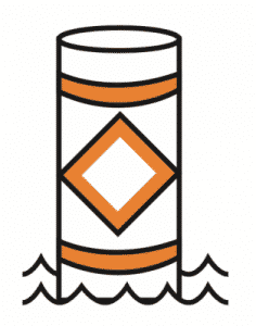 Hazard Buoy – Marks random hazards such as rocks and shoals. This type of buoy is white in colour and is marked with an orange diamond with two horizontal orange bands, one above the diamond and one below. Information concerning the hazard is indicated by a black symbol displayed inside the orange diamond.