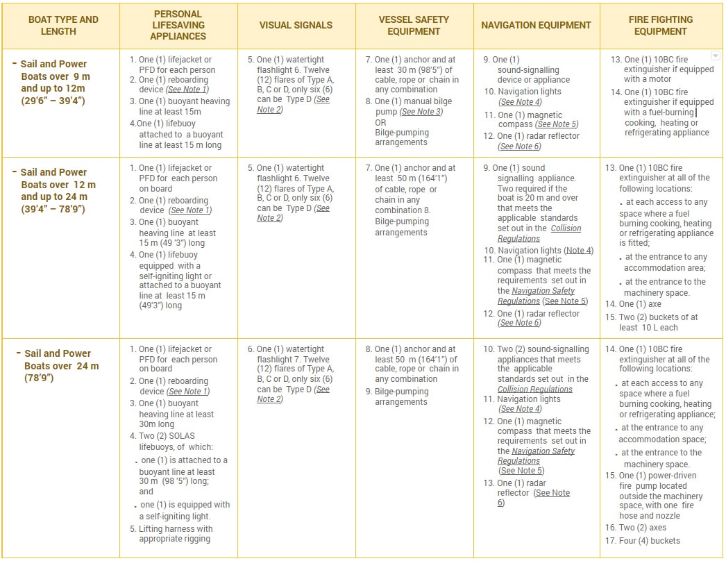 There are further exceptions to the required equipment for specific vessel types. Additional information on the following exceptions can be found in Section 2 Subparts 3, 4, and 5 of the Canadian Small Vessel Regulations.